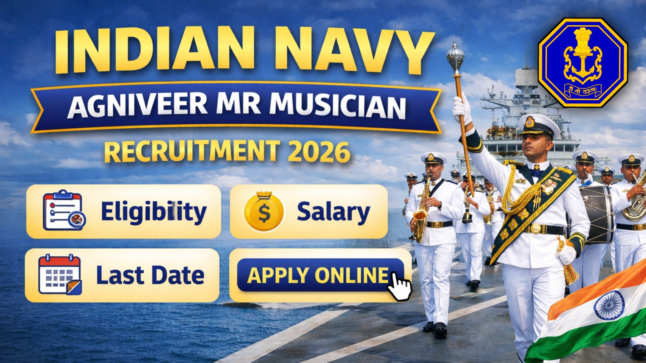 अगर आप संगीत के क्षेत्र में हुनर रखते हैं और साथ ही देश सेवा का सपना देखते हैं, तो Indian Navy Agniveer MR Musician Recruitment 2026 आपके लिए एक शानदार अवसर लेकर आया है। इस भर्ती का आयोजन भारतीय नौसेना (Indian Navy) द्वारा किया जा रहा है, जिसमें योग्य अभ्यर्थियों का चयन Agniveer MR (Musician) … Read more